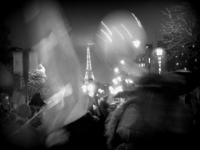 18h45 : La Tour Eiffel scintille!"Vous êtes tous très très courageux!" dit un organisateur au micro enjoignant les manifestants de ne pas se démobiliser jusqu'à l'arrivée au Champs de Mars. La pluie et la nuit tombent ensemble mais l'ambiance reste gaie, engagée et concernée!